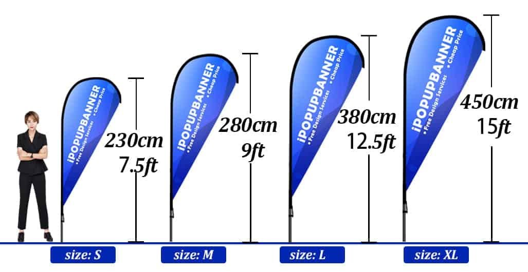 • Taille S (Drapeau Goutte Taille S) : 200 cm de hauteur totale, surface publicitaire 88 x 165 cm – idéale pour les petits événements ou les espaces intérieurs.